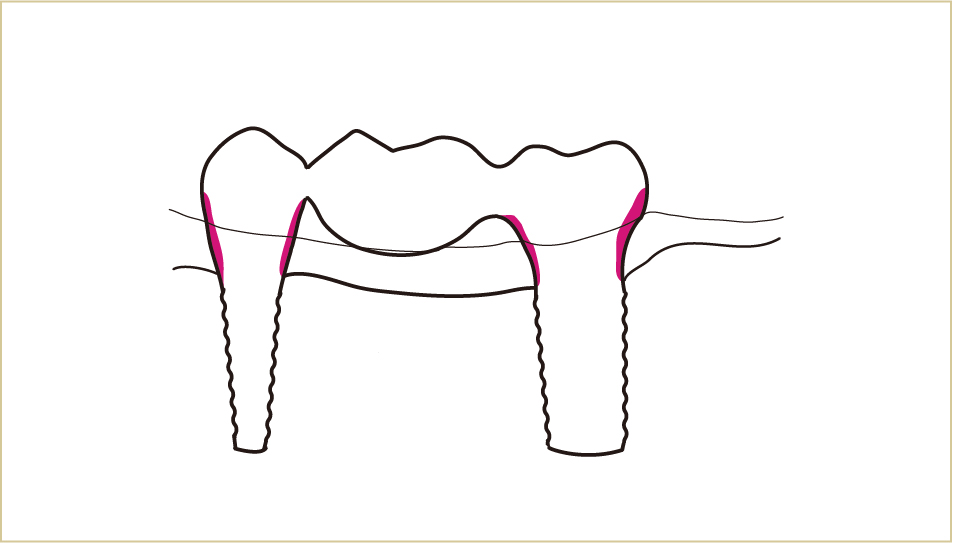 太線の部分をしっかりとみがいて清潔に保つことが、インプラントを長く使うポイントになる。