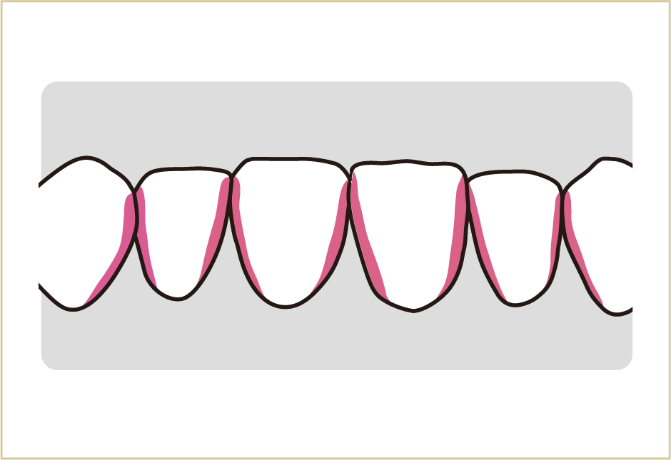 上の図は下の前歯を前から見た所です。このような歯と歯の間は歯ブラシでみがきにくく、虫歯にも歯周病にもなりやすい所です。